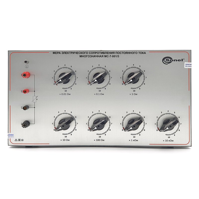 Мера серии МС-7-001 предназначена для воспроизведения электрического сопротивления в диапазоне от 0,01 до 111111,1 Ом. Мера представляет собой настольный лабораторный прибор, состоящий из 7 декад резисторов, соединяемых последовательно через поворотные переключатели ступеней декад.