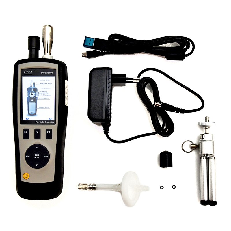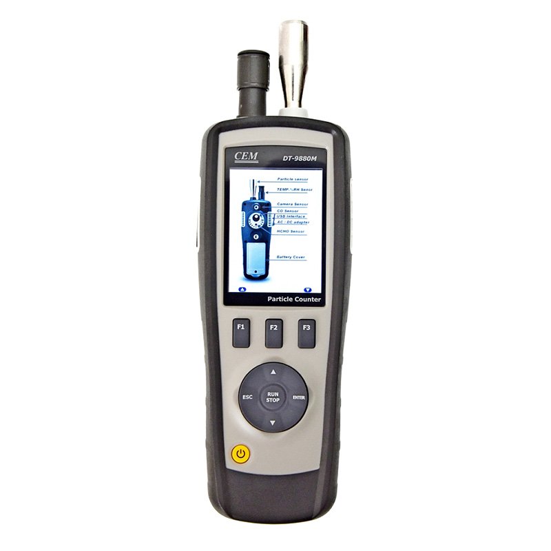 DT-9880M - счётчик пылевых частиц, оснащенный 2,8-дюймовым, цветным TFT ЖК-экраном и портом MicroSD для хранения фотографий (JPEG) и видеозаписей (3GP) с возможностью последующего просмотра на персональном компьютере.
